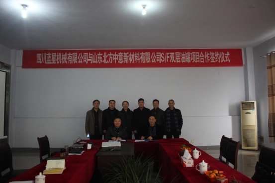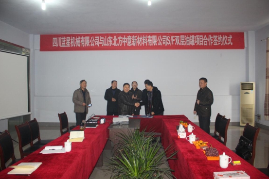 2015年12月29日,四川藍星機械有限公司與山東北方中意新材料有限公司S/F雙層油罐項目合作簽約儀式在山東北方中意新材料有限公司會議室圓滿成功舉行。S/F雙層油罐項目合作是兩家公司的新起點、新方向,市場前景廣闊,雙方的深入交流與合作必定能極大的推動兩公司的創(chuàng)新發(fā)展。